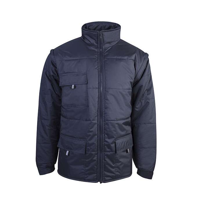 giubbino impermeabile poliestere pongee, maniche asportabili, tasche con velcro e occhiello catarifrangente, polsino elastico regolabile con velcro, tasca interna, zip lunga con cursore removibile