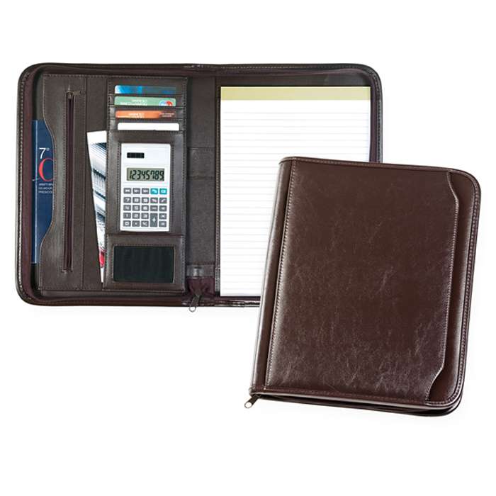 cartella sottobraccio, interno multitasche, blocco per appunti e calcolatrice 8 cifre, chiusura con cerniera, corredata di astuccio, tecnica di stampa consigliata: serigrafica - UV