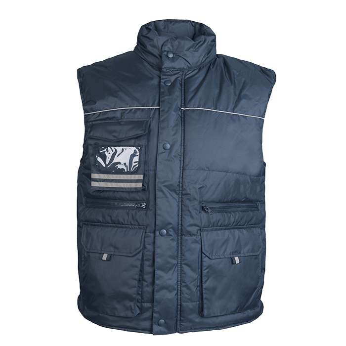 giubbino smanicato in poliestere pongee, zip a scomparsa con cursore removibile, copricerniera con bottoni a pressione, elastico giromanica antivento, imbottitura pesante e fodera in poliestere, profili rifrangenti, tasca frontale sul petto con portabadge a scomparsa, 2 doppie tasche con patta e chiusura con velcro, 2 tasche con zip, tasca interna portacellulare, tasca interna portafogli
