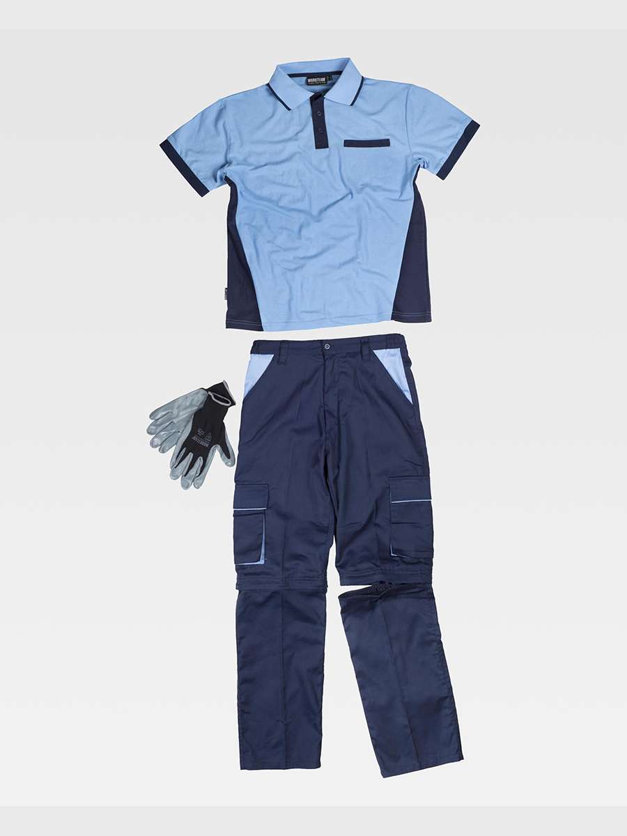 Pantalone bicolore fondo dritto multitasche con elastico in vita; Gamba staccabile; Chiusura con bottone e patta con cerniera; Polo manica corta bicolore con taschino sul petto e chiusura con bottoni nel collo; Guanti rivestiti in nitrile; PANTALONE STACCABILE !