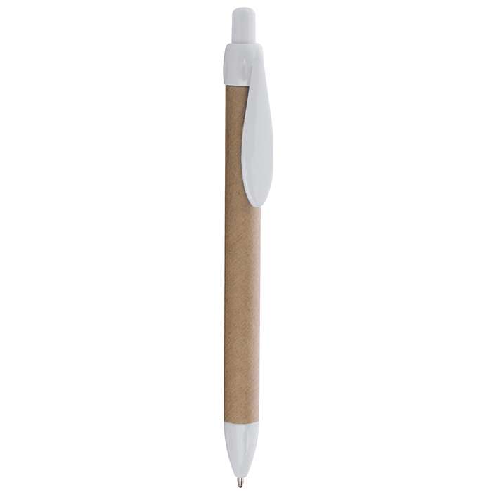 penna a sfera, meccanismo a scatto, corpo in carta colorata, clip e minuterie in plastica, refill con sfera al tungsteno, inchiostro nero, tecnica di stampa consigliata: serigrafica - tampografica - UV