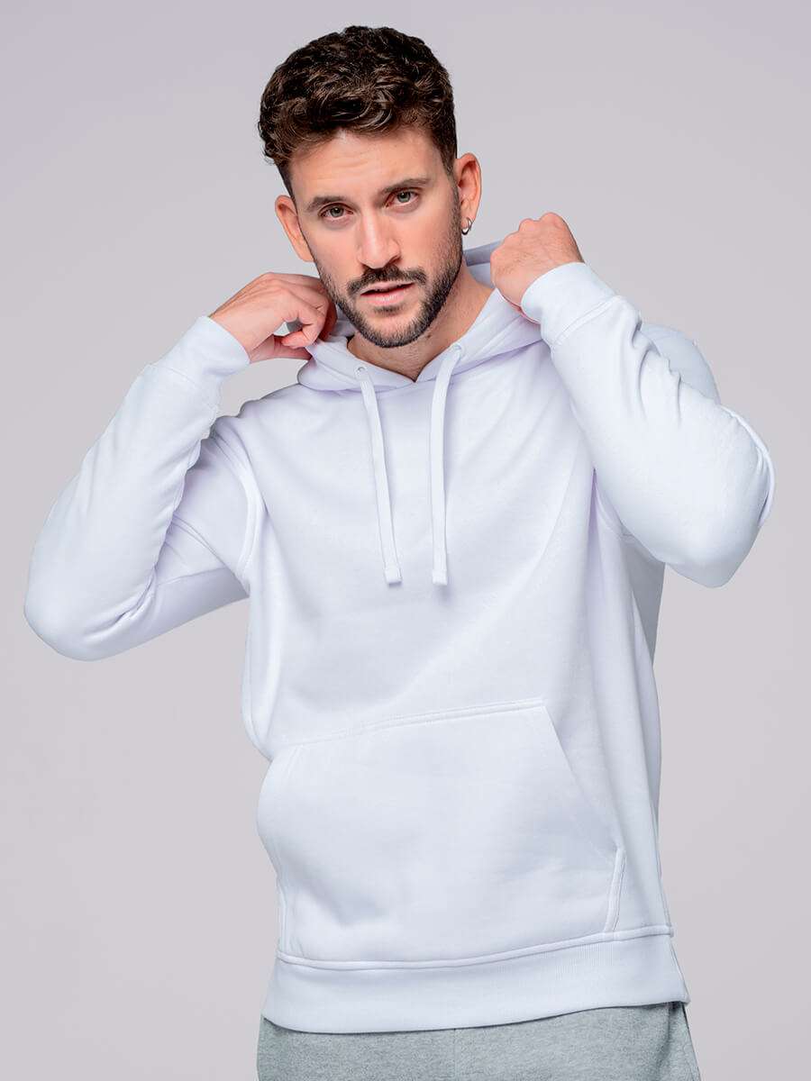 Felpa da uomo con cappuccio in tessuto leggero French Terry; Doppia cucitura su collo, polsini e fondo; Costine 1x1 polsini e fondo in lycra; Cordino piatto dello stesso colore del tessuto; Tasche a marsupio