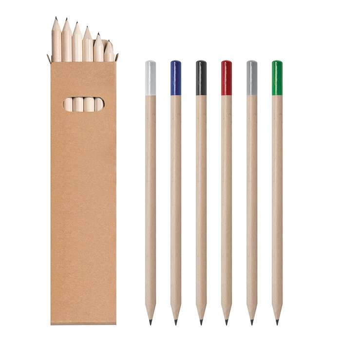 set 6 matite con finitura colorata; corpo acero; fornite già temperate; corredato di astuccio in carta naturale; tecnica di stampa consigliata: serigrafica - tampografica - UV