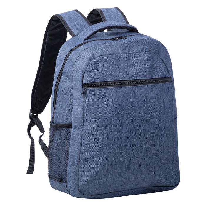 zaino in poliestere 600D, effetto melange, vano imbottito interno porta pc, tasca frontale con zip, tasca 222 in materiale traforato, spallacci imbottiti e regolabili