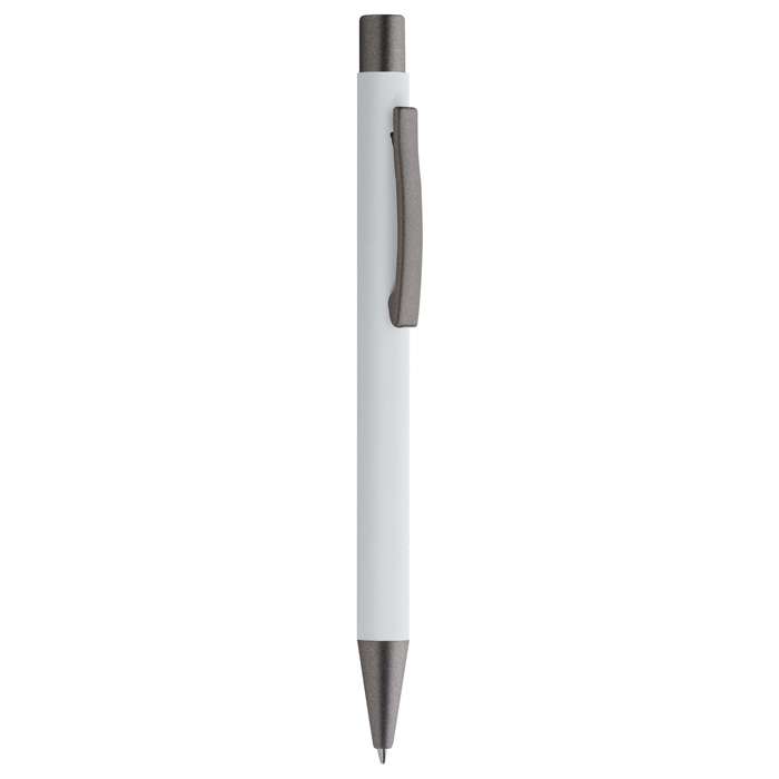 penna a sfera in metallo, meccanismo a scatto, fusto in metallo satinato, rifinitura matta, minuterie in grigio, refill nero