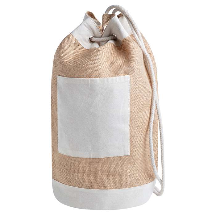 sacca zaino juta e cotone, tasca frontale in cotone, chiusura con corda, Tecnica di stampa consigliata: Serigrafia - Transfer