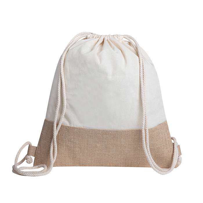 sacca zaino cotone e juta, doppia corda di chiusura, colore naturale, Tecnica di stampa consigliata: Serigrafica - Transfer - Digitale, 150 GR