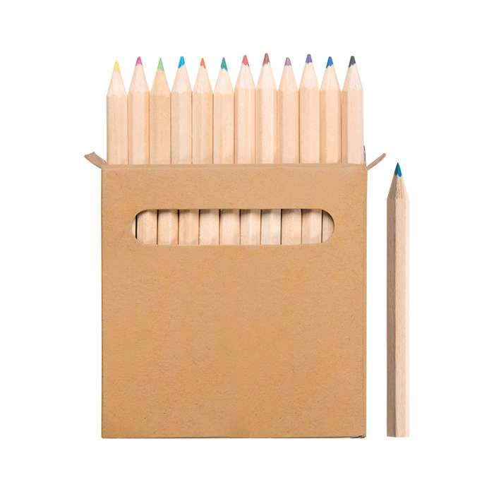 set 12 mini pastelli forniti già temperati, custodia in cartoncino naturale, tecnica di stampa consigliata: serigrafica - tampografica - UV