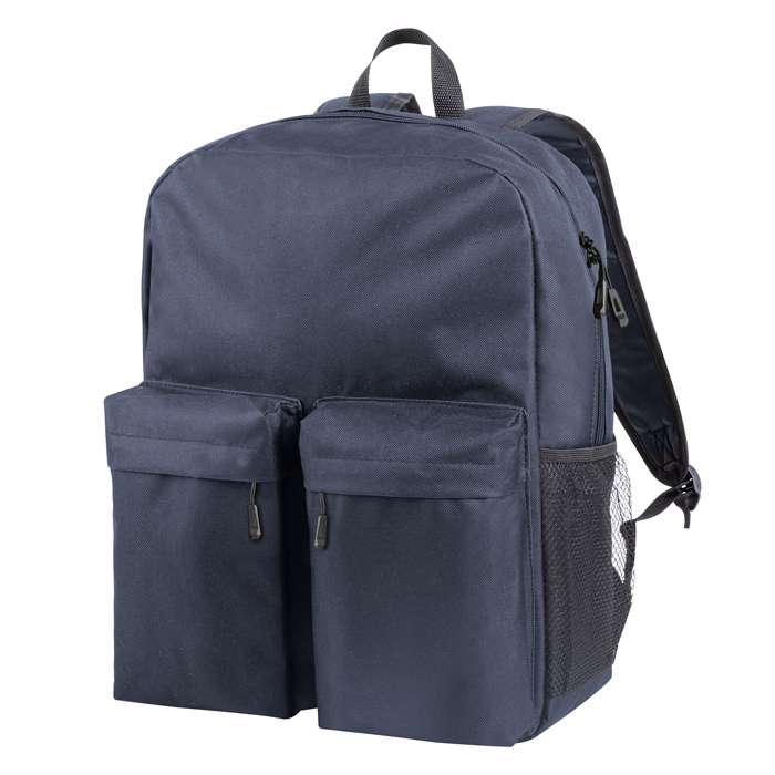 zaino in poliestere 600D, tasche laterali in materiale traforato, due tasche frontali, compartimento interno, retro imbottito, spallacci regolabili