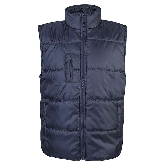 giubbino smanicato in poliestere, zip lunga con cursore removibile, tasca interna, tasca frontale verticale con badge a scomparsa, due tasche laterali