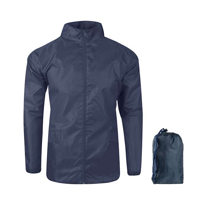 impermeabile antivento, cappuccio a scomparsa, laccio stringivita, tasche laterali, ripiegabile in custodia, polsini elastici, interno a contrasto