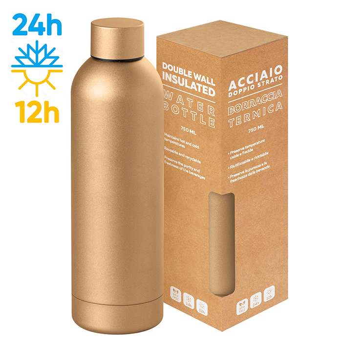 borraccia in acciaio inox 304/201, tappo in acciaio, doppio strato, capacità750 ml, rifinitura matta metallica, box incluso