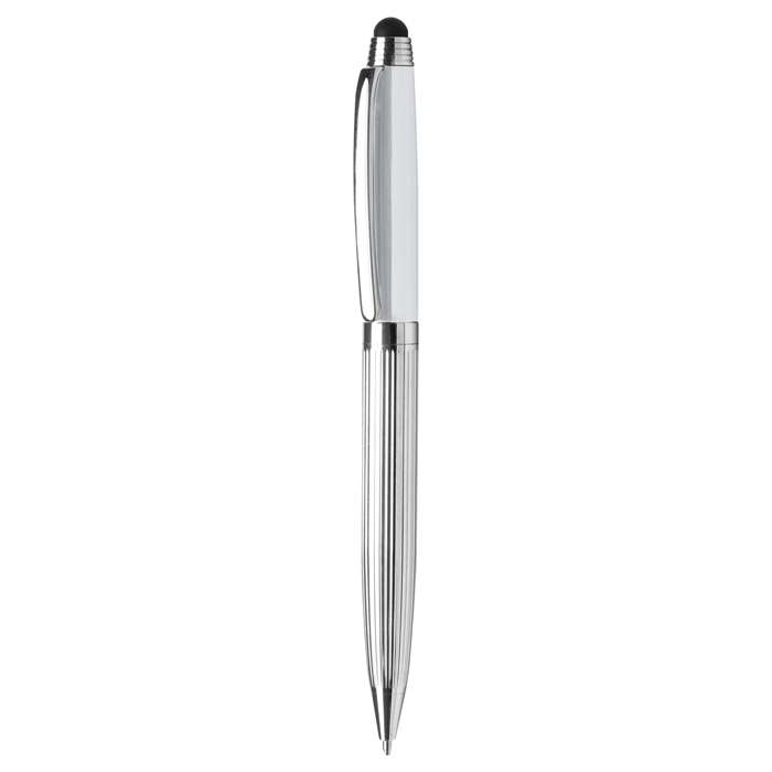penna a sfera, gommino per touch screen, meccanismo a rotazione, cappuccio in lacca lucida, minuterie in metallo cromato, refill in metallo con sfera al tungsteno, inchiostro nero, corredata di astuccio, tecnica di stampa consigliata: serigrafica - tampografica - UV - incisione su penna