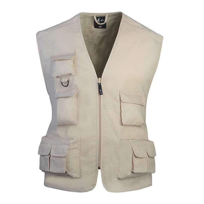 gilet in policotton multitasche, chiusura con zip, fodera interna in tessuto traspirante, doppia tasca sul retro, gancio portachiavi