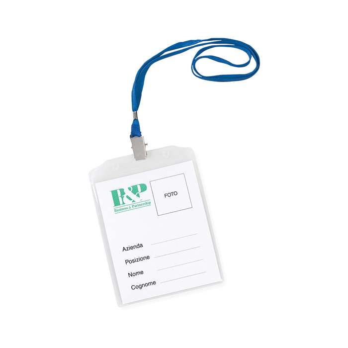 portabadge con nastrino e clip nichelata, cartoncino neutro incluso, tecnica di stampa consigliata: serigrafica