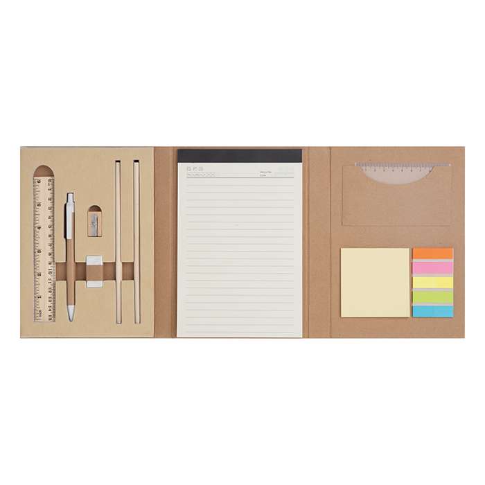 set notes, blocco per appunti, 1 blocco di fogli adesivi, 5 blocchi segnapagina colorati adesivi, 1 righello 15cm in legno, penna a sfera refill inchiostro nero, 2 matite, 1 temperamatite in legno, 1 gomma per cancellare, righello in pvc, tecnica di stampa consigliata: serigrafica - UV