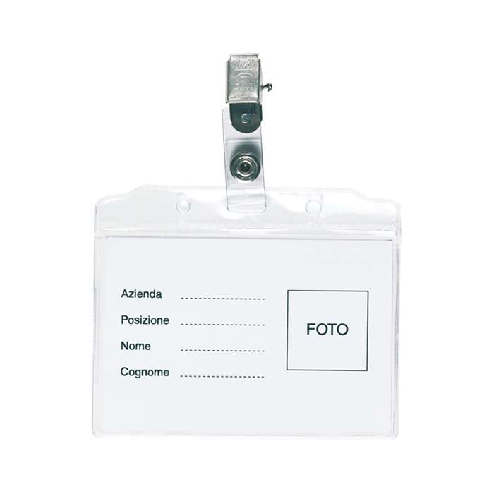 portabadge con clip nichelata, cartoncino neutro incluso, tecnica di stampa consigliata: serigrafica