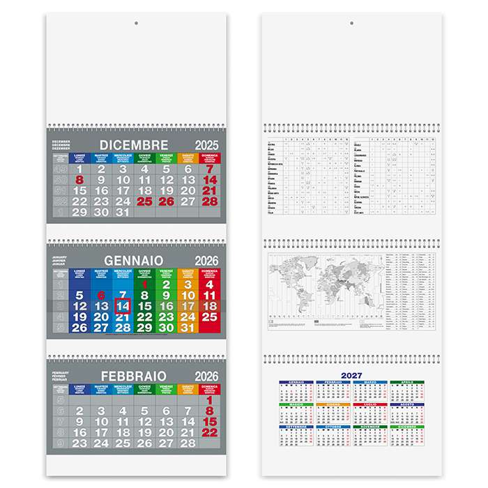 calendario trittico 3 spirali, 3 blocchi da 12 fogli, carta naturale 70gr, testata e supporto cartoncino lusso 600gr, notizie utili stampate sul supporto in cartoncino, festivitàinternazionali, cursore incluso montato, tecnica di stampa consigliata: adesivo digitale - serigrafica