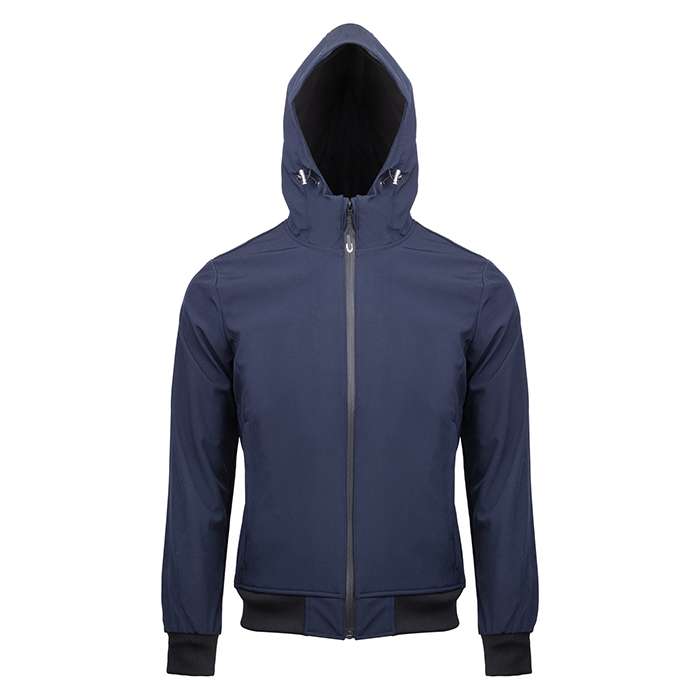 Giubbotto in tessuto impermeabile doppio strato soft shell; cerniera centrale antiacqua taglio laser; cappuccio regolabile; tasche con zip coperte; tasca interna con zip