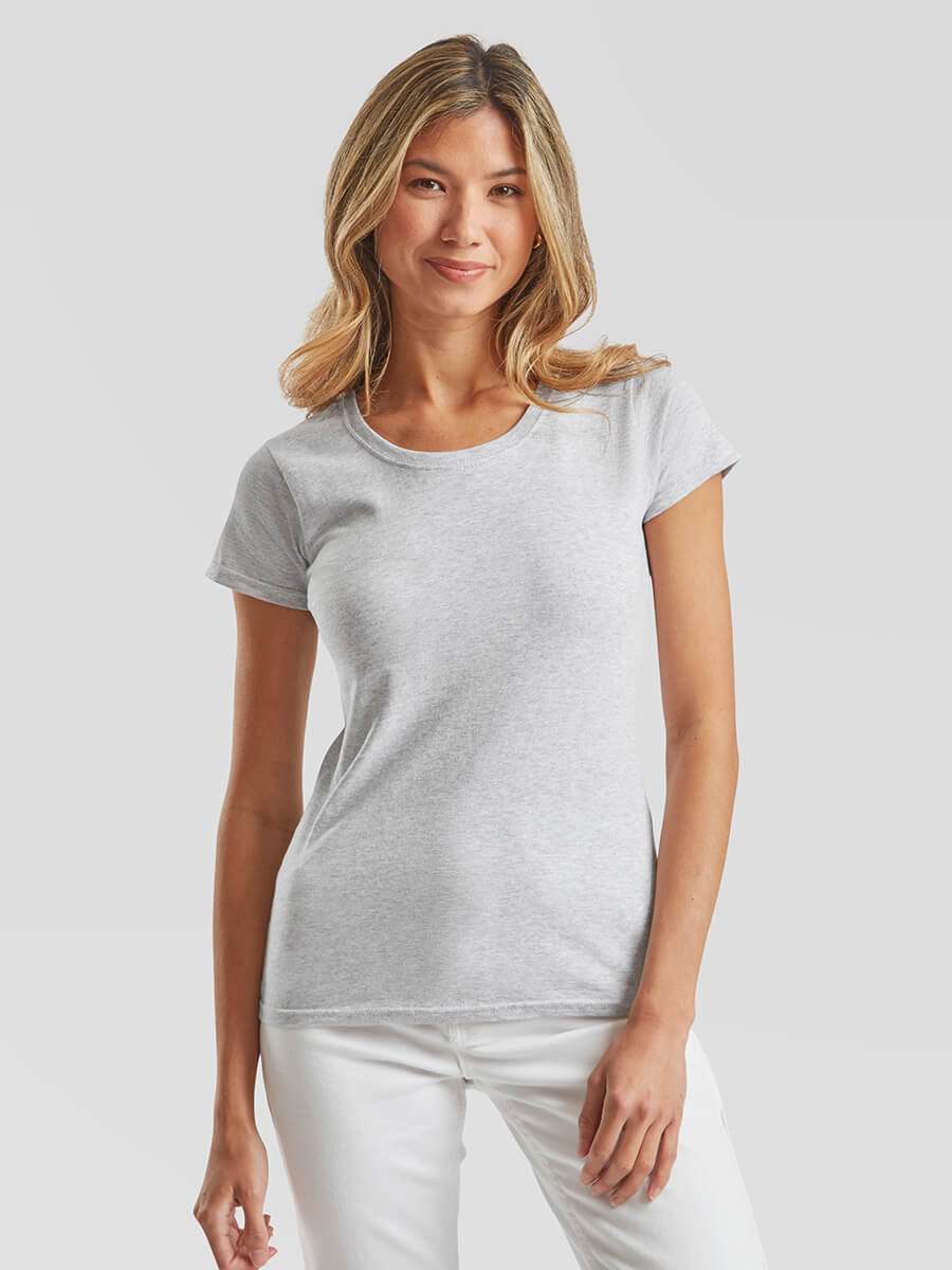T-shirt girocollo con fettuccia sul collo dello stesso tessuto della t-shirt; Tessitura compatta per una migliore stampabilità; Cuciture laterali sagomate per un taglio più femminile