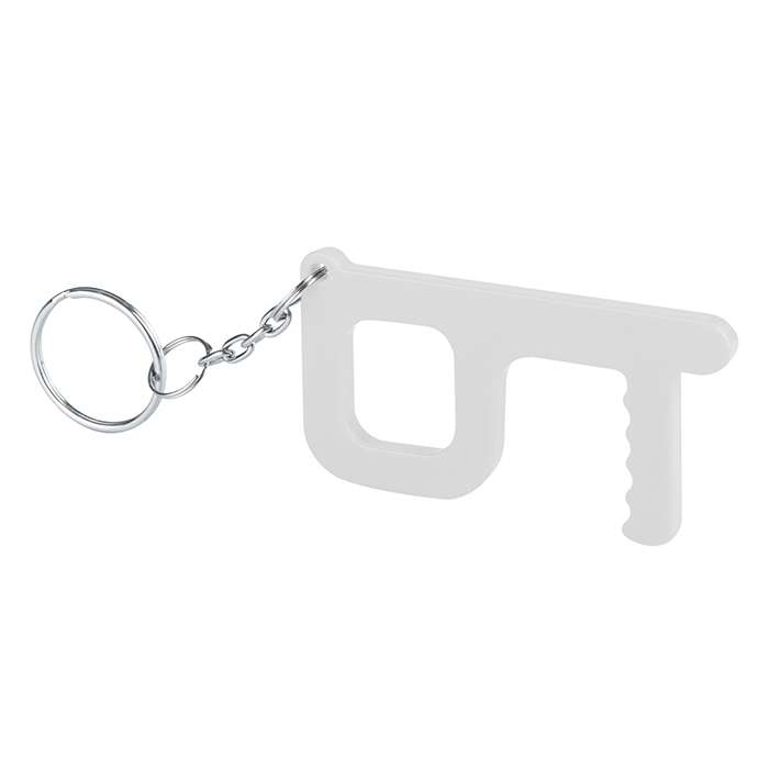 portachiavi anti-contatto, realizzato in plastica antibatterica, appositamente progettato per evitare di toccare le superfici di uso comune, comoda impugnatura per il dito, tecnica di stampa consigliata: tampografica - incisione - UV