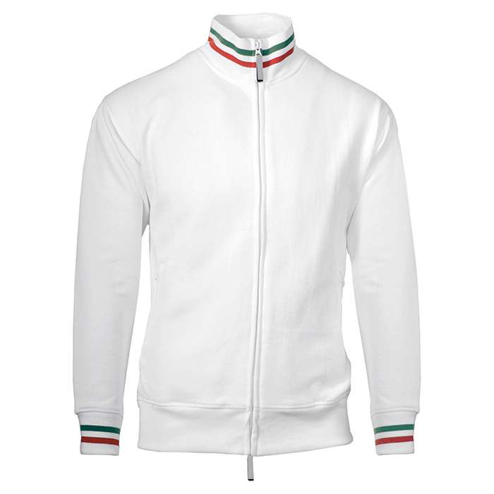felpa con collo a lupetto tricolore, zip lunga nascosta, doppio cursore, polsini e girovita elasticizzati, 2 tasche con zip, ribattitura doppio ago su collo, maniche e orlo, nastro di rinforzo interno da spalla a spalla, colori reattivi, 280 g/m2