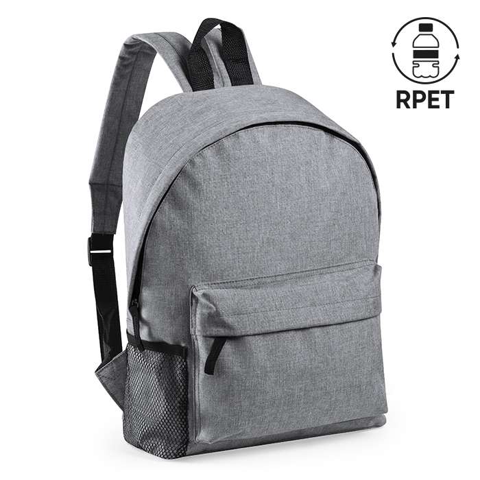 zaino in RPET nylon 600D, tasca anteriore, spallacci e retro imbottiti, tasca 222, tecnica di stampa consigliata: serigrafica - transfer