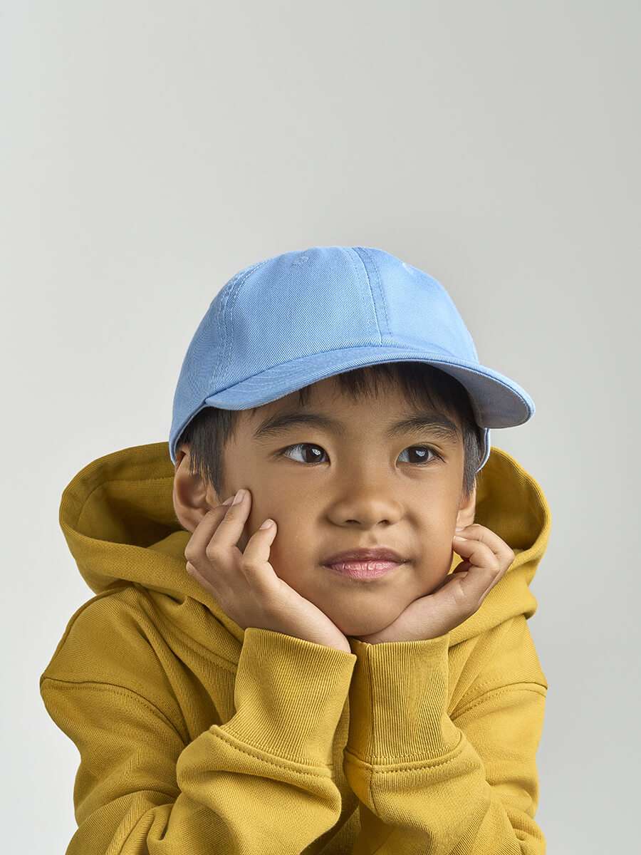 Cappellino 6 pannelli destrutturato da bambino, in cotone biologico certificato; Stile dad hat con visiera centrale e chiusura a strappo