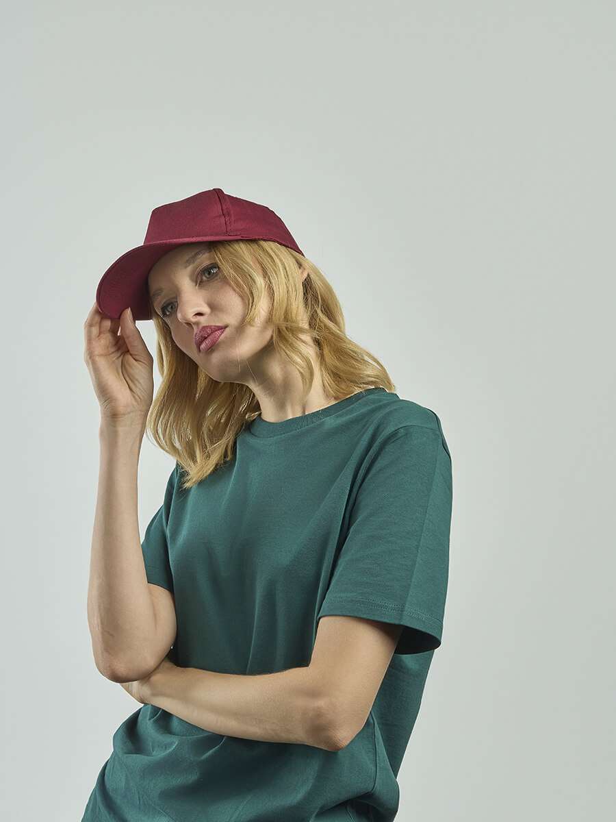 5 pannelli; occhielli ricamati; pannello frontale rinforzato; visiera pre-curvata; chiusura in velcro; 6 cuciture su visiera; parasudore in poliestere