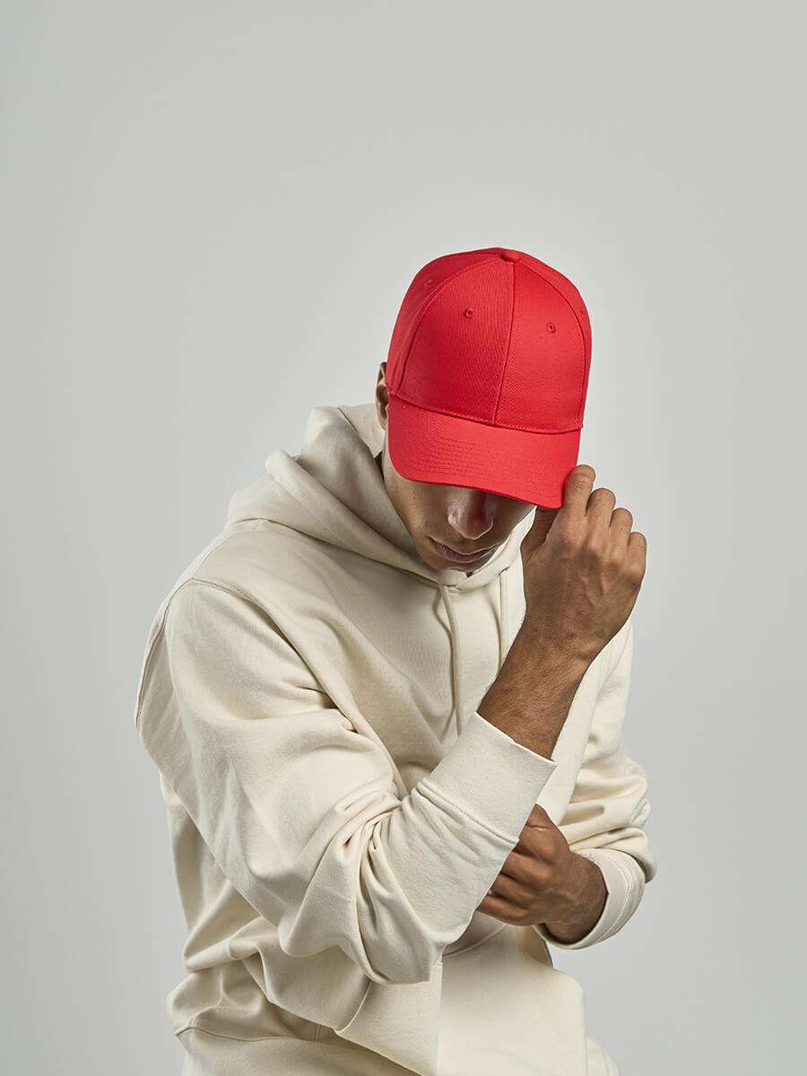 6 pannelli; occhielli ricamati; visiera pre-curvata; chiusura con fibia di metallo; 4 cuciture su visiera