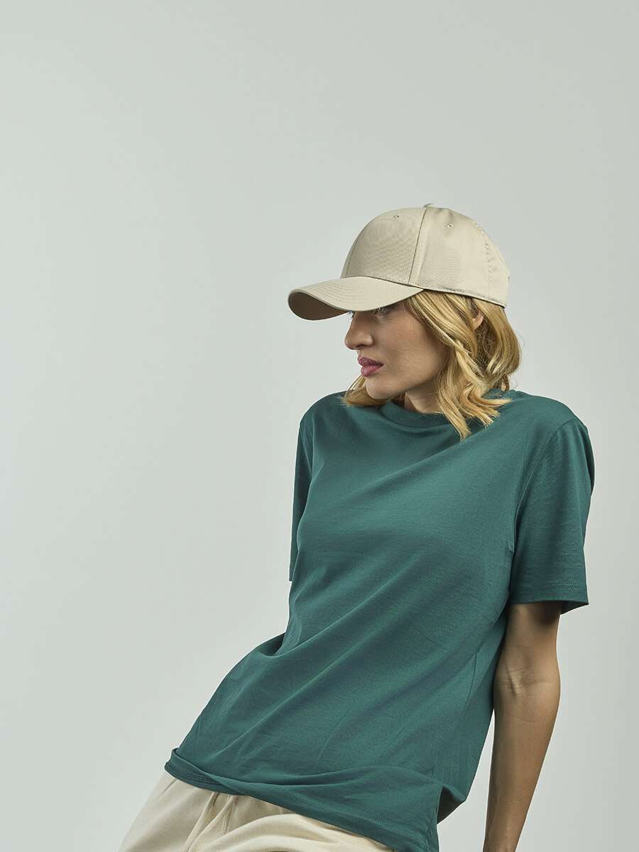 6 pannelli; occhielli ricamati; pannello frontale rinforzato; chiusura in velcro; 4 cuciture su visiera; parasudore: 35% cotone - 65% poliestere; parasudore in poliestere