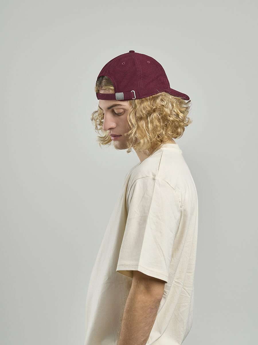 Cappello da baseball destrutturato a 6 pannelli in velluto a coste 21 wales ( righe per pollice) di poliestere riciclato; Visiera a curvatura media, chiusura con fibbia in metallo e foro in metallo; Look vintage e calda sensazione al tatto; 6 Pannelli; 6 Cuciture sulla visiera
