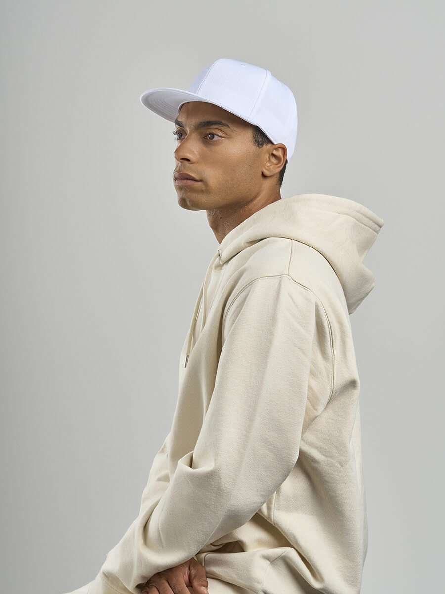 Modello strutturato a 6 pannelli con cuciture in tinta e chiusura snapback in pvc; Realizzato in 100% poliestere riciclato certificato Linee old school e visiera piatta