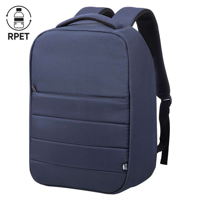 zaino in RPET 300D, sistema di chiusura sul retro antitaccheggio, tasca interna imbottita porta pc/tablet, fascia trolley posteriore, retro e spallacci imbottiti, laptop fino a 15