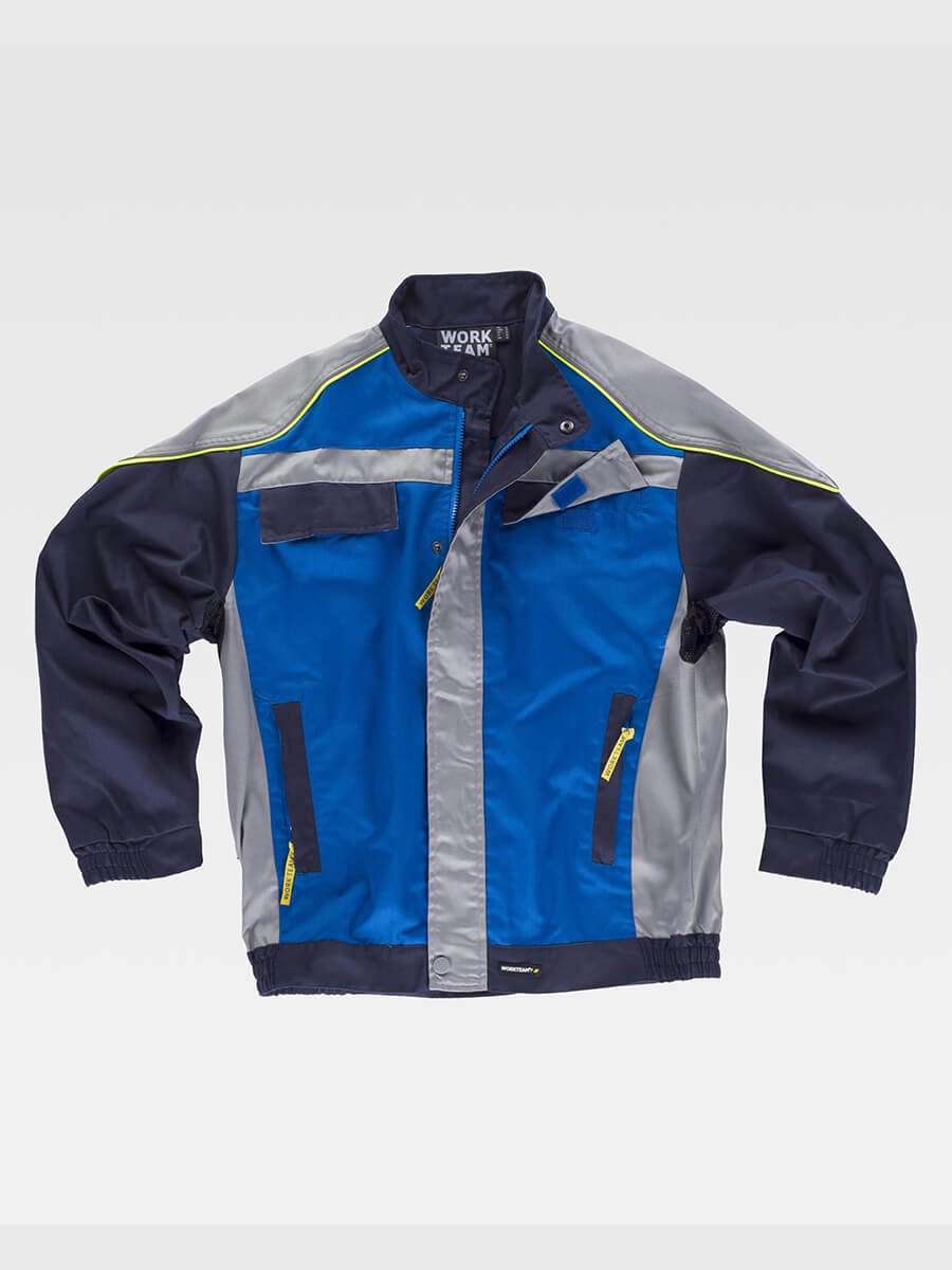 Giacca con bottoni automatici e cerniera in nylon nascosta da risvolto; Collo altoPolsi con elastici; Due tasche sul petto con patta in velcro,due tasche laterali interne; combinato tricoloreBordi ad alta visibilitàElastico in vita