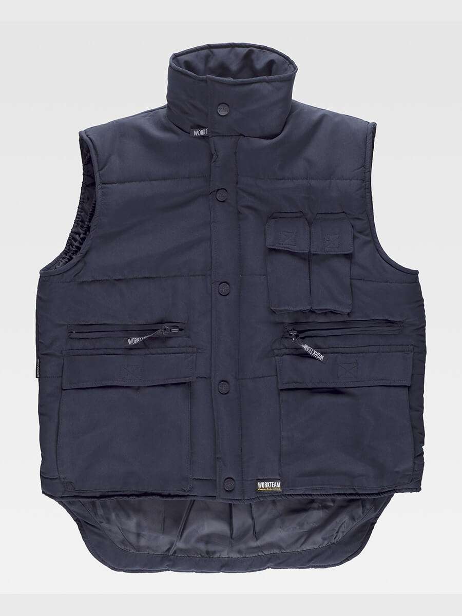 Gilet imbottito collo alto, giromanica regolabile ed elastico in vita; chiusura con cerniera in nylon e bottoni automatici; Due tasche sul petto per cellulare con patte in velcro; Due tasche interne con cerniera e due tasche laterali con patte in velcro