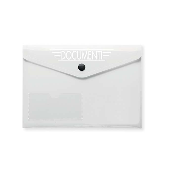 busta portadocumenti, tasca esterna porta tessera, chiusura con bottone nero, tecnica di stampa consigliata: serigrafica