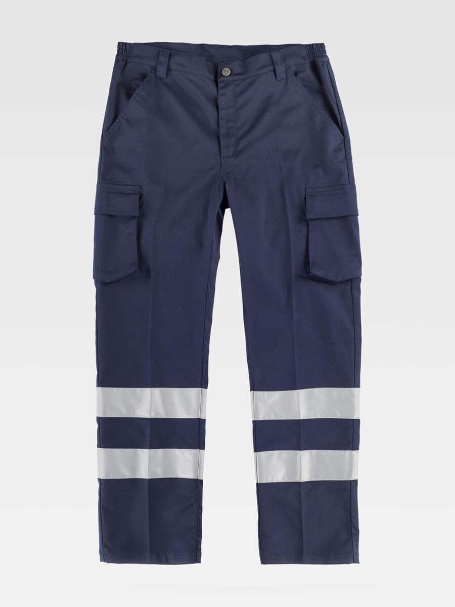 Pantalone multitasche con bande rifrangenti, Slim Fit elasticizzato; Due bande rifrangenti sulle gambe; Elastico nei laterali della vita; Bottone e patta con cerniera; Certificazione: EN 17353 TIPO B 2