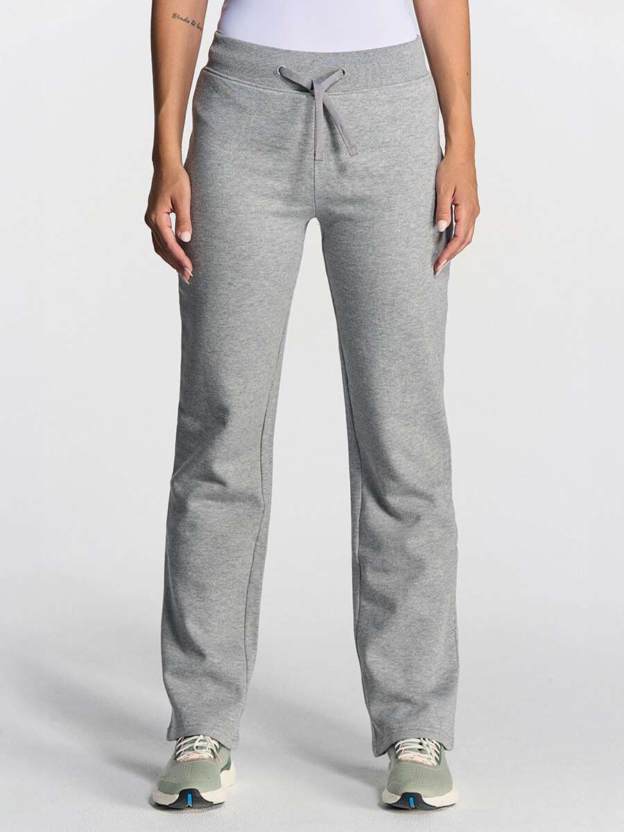 Pantalone donna in felpa, taglio femminile; Ampio elastico in vita con coulisse; Cordino in tinta e fondo aperto