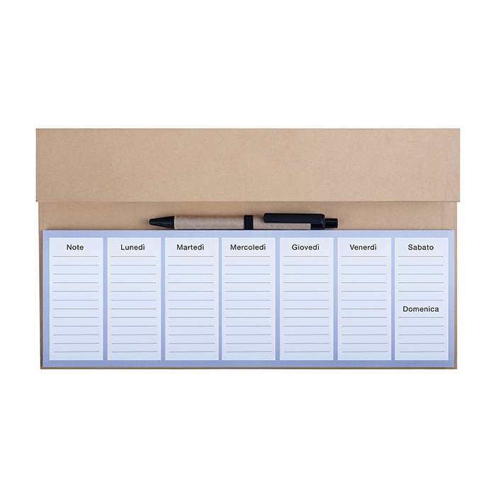 planning, 52 fogli settimanali, 4 blocchi fogli adesivi colorati, 5 blocchi segnapagine adesivi colorati, penna in carta inclusa