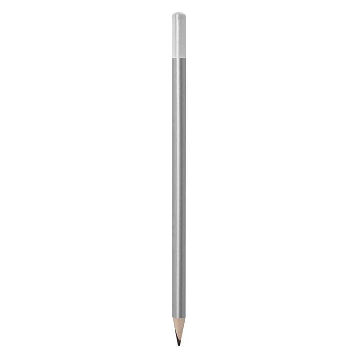 matita con finitura bicolore, corpo silver, fornite giàtemperate, tecnica di stampa consigliata: serigrafica - tampografica - UV