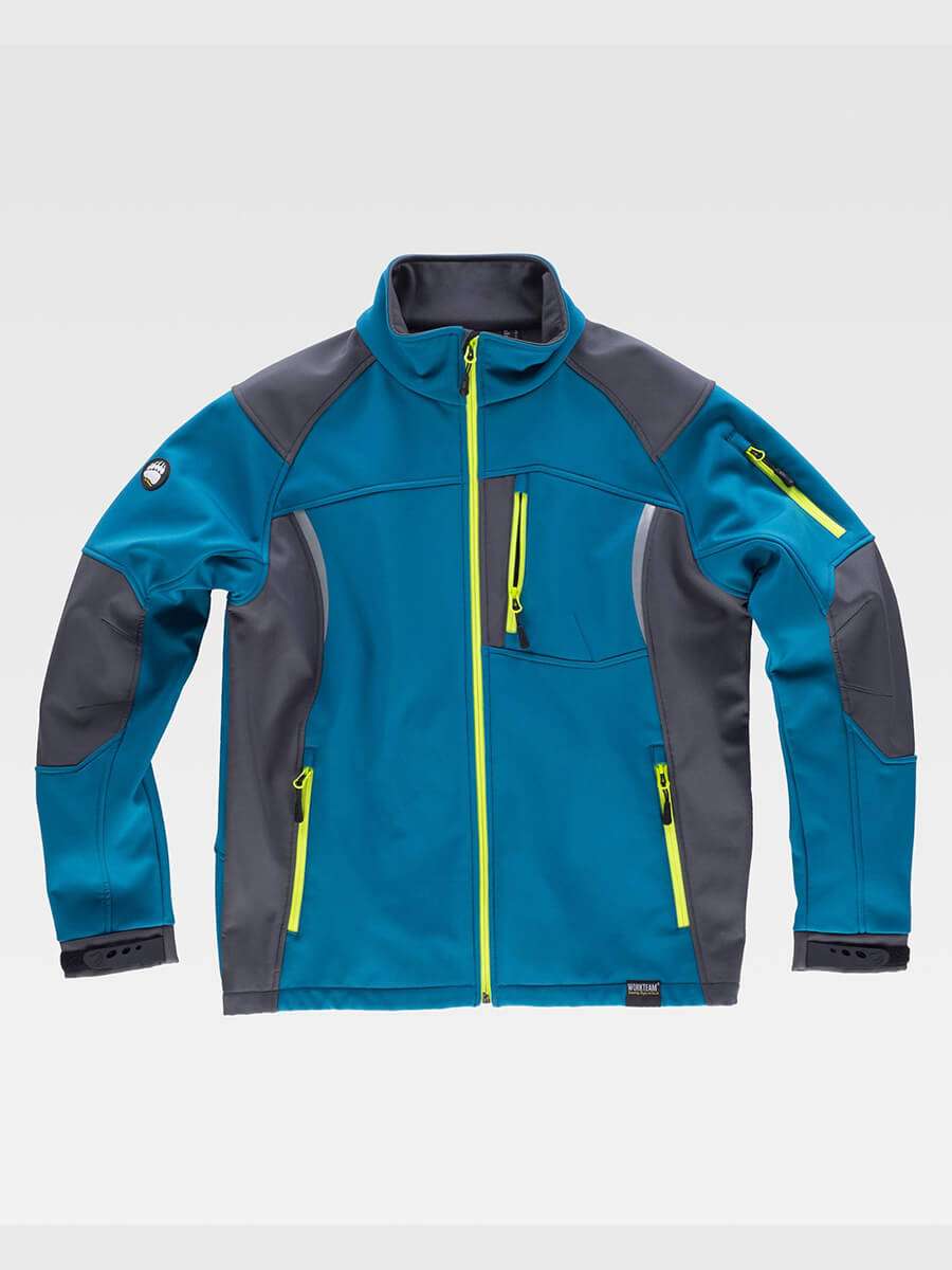 Giacca WORKSHELL maniche raglan, collo alto; Elastico regolabile sul fondo,polsini regolabili con velcro; Una tasca sul petto ed due laterali con cerniera; Detagli rifrangenti; Tessuto antivento repellente all'acqua e resistente allo strappo con membrana interna traspirante e isolante e interno termico